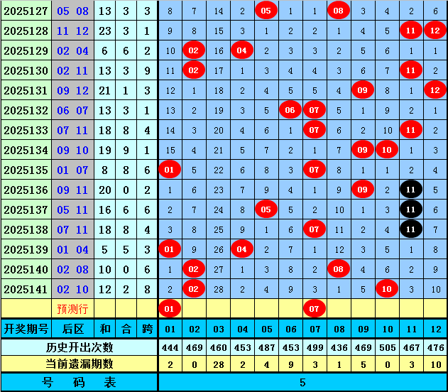 前区一号球分析:上期开出奖号04,该位最近10期出现限制在01-08之间,中点为4.5,其中中点以下的奖号开出6次,中点以上的奖号出现4次,本期看好该位走大,留神中点以上号码,关心号码09。